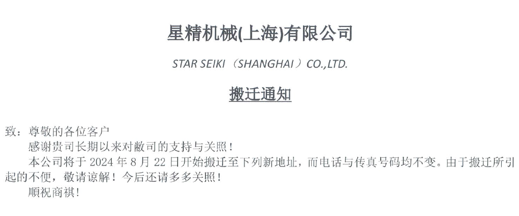 星精機械(上海)有限公司搬遷通知